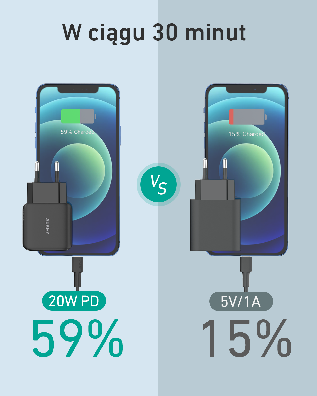 Szybka ładowarka Aukey PA-R1 wyposażona została w zaawansowane technologie Power Delivery 3.0 oraz Quick Charge 3.0. Urządzenia naładujesz dzięki niej nawet trzykrotnie szybciej niż przy użyciu tradycyjnej ładowarki. Dość powiedzieć, że wystarczy tylko 30 minut, by od 0% do 59% naładować na przykład iPhone’a 12! Oszczędność czasu i nerwów? Jeszcze jaka!