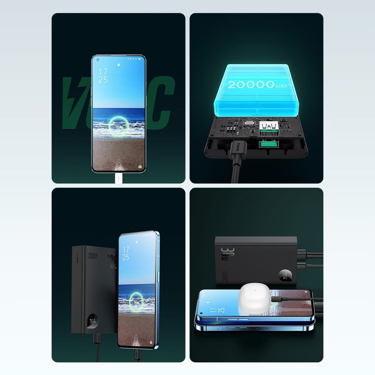Powerbank o pojemności 20000 mAh marki Baseus. Obsługuje prąd wyjściowy o maksymalnej mocy 30W. Obsługuje wiele standardów szybkiego ładowania m.in. SCP, Quick Charge 3.0, Power Delivery 3.0. Dzięki oficjalnej autoryzacji wspiera także standard Oppo Super VOOC. Ma wbudowane 2 wyjściowe porty USB oraz port wejściowo-wyjściowy USB Typ C (do ładowania telefonów i samego powerbanku) Ekran LED, który znajduje się na jego obudowie wskazuje poziom naładowania akumulatorów. Układ scalony obsługuje wiele zabezpieczeń, które chronią podłączone urządzenia przed uszkodzeniem.