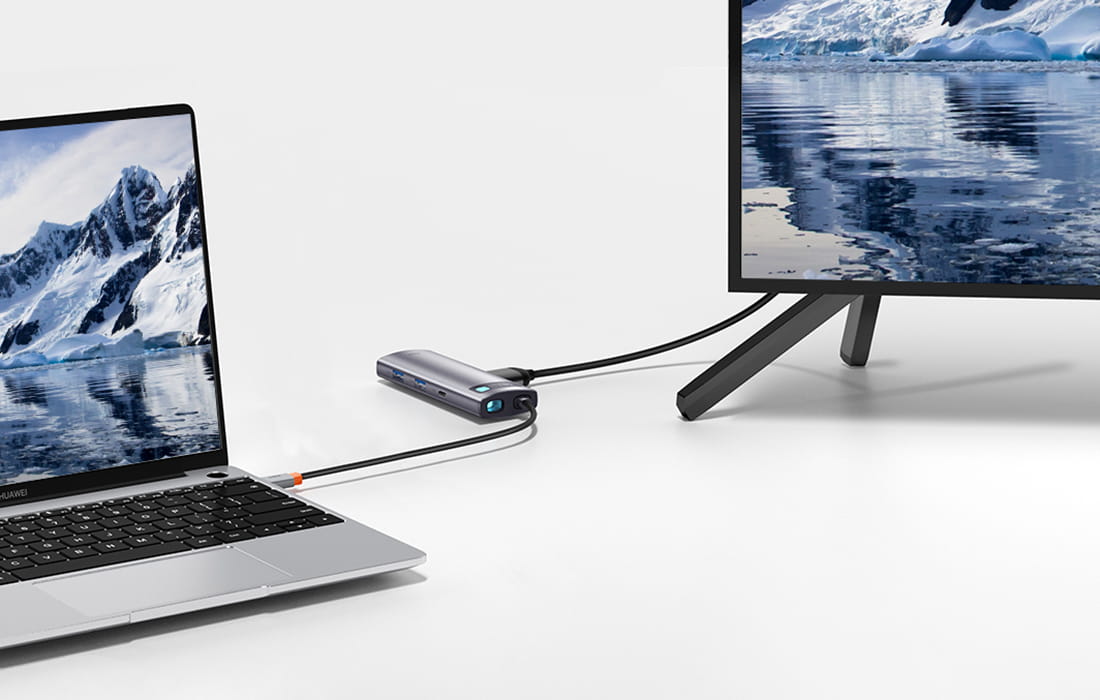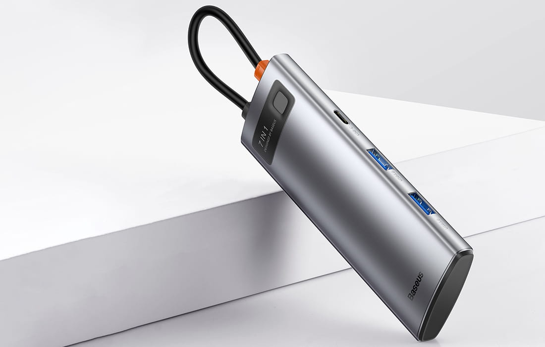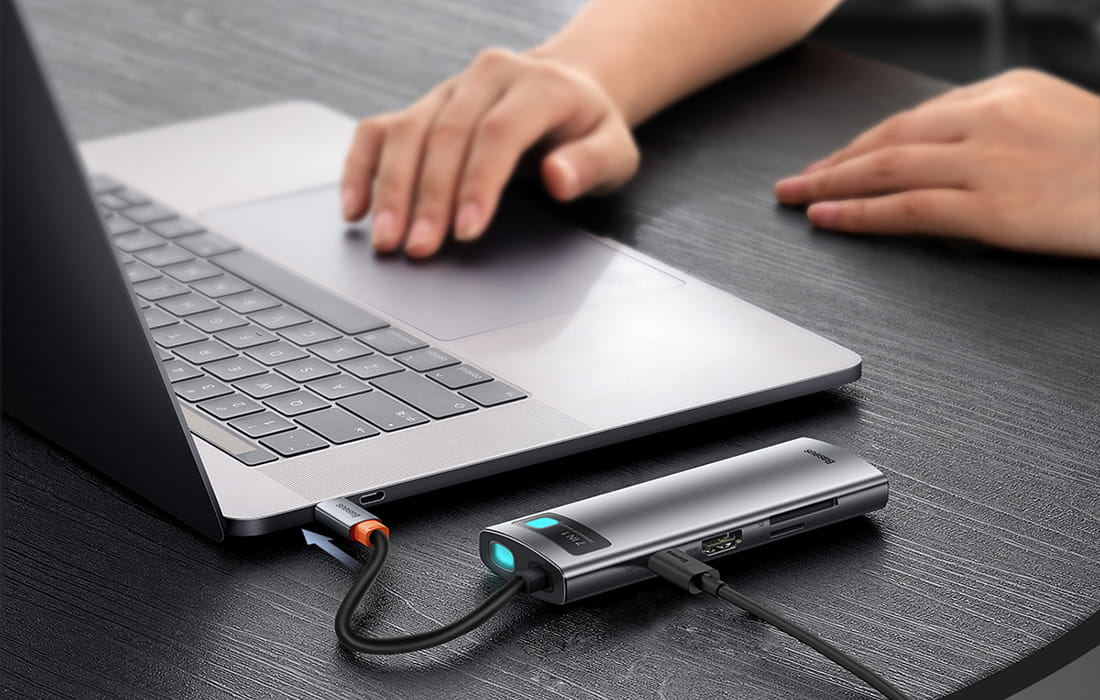 Użyj adaptera Baseus, aby błyskawicznie przesyłać pliki (500MB/s), szybko ładować urządzenia (PD 100W) lub wyświetlać pliki na większym ekranie w doskonałej jakości (4K@30Hz). Akcesorium zostało wyposażone w aż 7 portów, dzięki czemu już nie musisz przejmować się brakiem odpowiednich wejść w telefonie, laptopie, itp. Dodatkowo wskaźnik LED poinformuje Cię o statusie urządzenia.