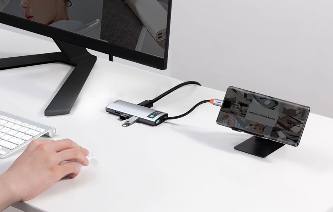 To nie koniec możliwości! Za pomocą stacji dokującej Baseus możesz na przykład zmienić swój telefon w hosta, co idealnie sprawdzi się podczas pracy mobilnej. Urządzenie obsługuje też funkcję OTG. To oznacza, że za jego pomocą możesz na przykład wyświetlać obraz z kompatybilnych smartfonów na dużym ekranie lub łączyć je z dyskami przenośnymi.