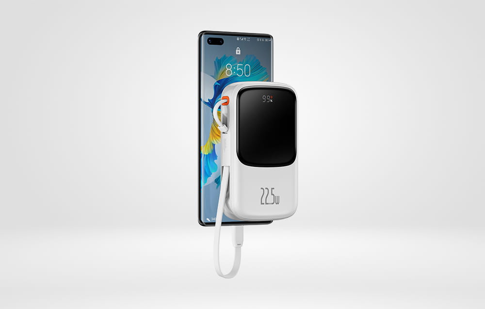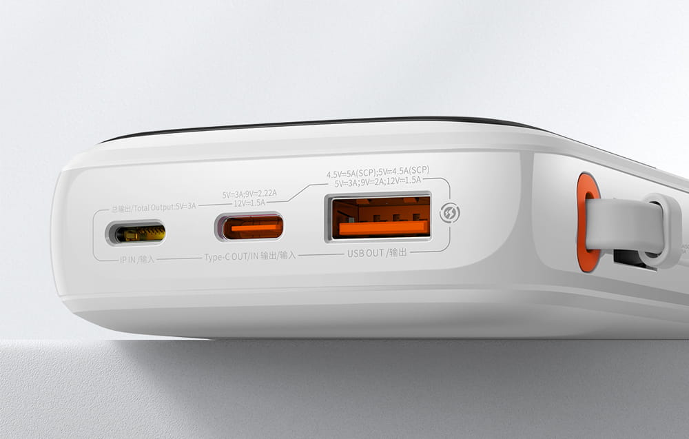 Powerbank Baseus Qpow Pro z kablem USB-C umożliwia ładowanie nawet 3 urządzeń jednocześnie. Kabel USB-C ładuje z mocą 22,5 W, dodatkowo powerbank posiada wyjścia USB i USB-C, dzięki czemu pozwala odnawiać energię kilku różnych urządzeń naraz. Obsługuje protokoły SCP, FCP, QC i PD, a w zaledwie 30 minut naładuje Apple 13 do poziomu 50 %.