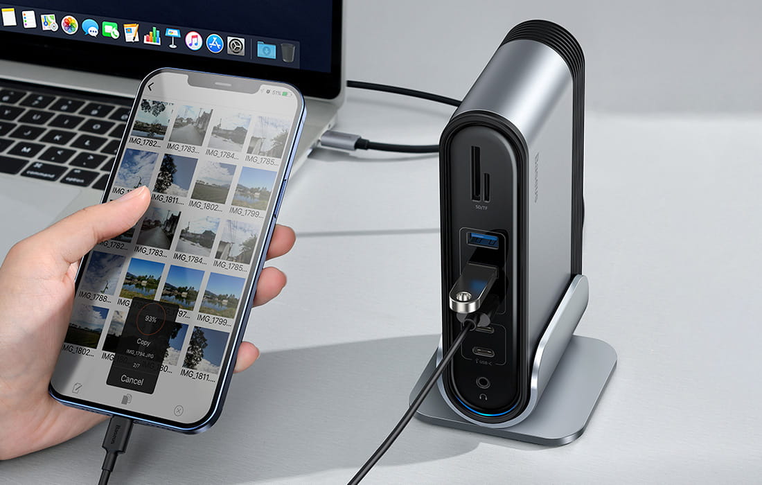Funkcjonalny Hub od Baseusa pozwoli Ci na wykonywanie wielu czynności jednocześnie. Posiada aż 16 różnych wejść, dzięki którym możesz zapomnieć o niewystarczającej ilości portów w Twoim komputerze. Zawiera wejście na kartę pamięci SD/micro SD, 3 x USB 3.0, 2 x USB-C, Audio, PD, PC, 2 x USB 2.0, VGA, HDMI, DC 12V oraz RJ45.