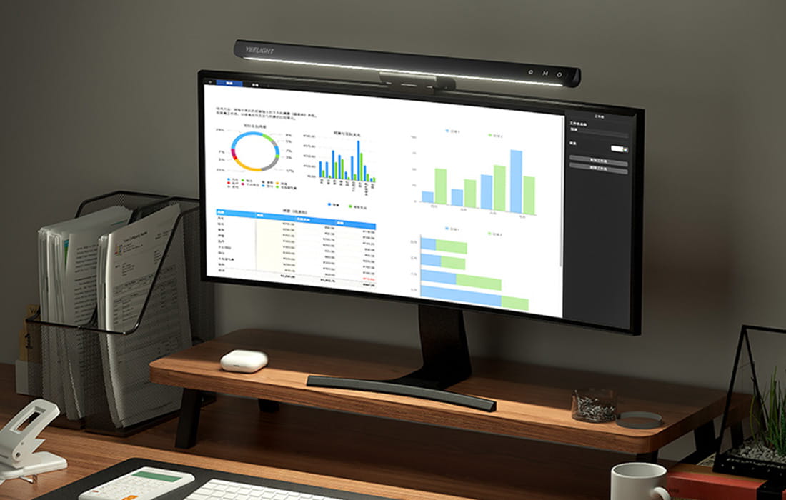 Często spędzasz czas przy komputerze? Zapewnij sobie odpowiednie oświetlenie! Światło generowane przez lampę Yeelight Light Bar pada w dół, a nie bezpośrednio do oczu, dzięki czemu nie razi, jest bezpieczne dla wzroku i pozwala uniknąć bólu głowy. Nie powoduje też odblasków ani nie miga. Wyróżnia je także wysoki współczynnik CRI (Ra>95), co oznacza, że doskonale odwzorowuje barwy. Dzięki temu widoczne na monitorze obrazy będą zachwycać bogatą, a zarazem naturalną kolorystyką.