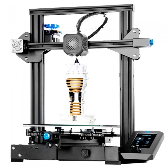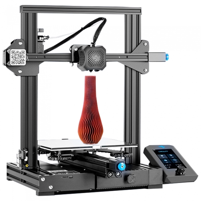 Ten model drukarki stanowi optymalną propozycję dla początkujących adeptów druku 3D, których w miarę rozwoju technologii FFF/FDM jest coraz więcej. Drukarka 3D Creality Ender-3 dostarczana jest w postaci zestawu do samodzielnego montażu – na przygotowanie urządzenia do pracy wystarczy zaledwie kilkanaście minut. Pole robocze ma wymiary 220 x 220 x 250 mm, a platforma podgrzewana jest do temp. maksymalnie 110 oC w ciągu 5 min. Wariant podstawowy, czyli drukarka Ender 3, przeznaczony jest do pracy z filamentami PLA, a także TPU, gradientowymi oraz wzbogaconymi o włókno węglowe. W zależności od wybranego modelu, użytkownik otrzymuje drukarkę 3D Creality Ender-3 wraz z pojedynczą dyszą o średnicy 0,4 mm lub z całym zestawem, zawierającym dodatkowe dwie dysze o średnicach 0,2 mm i 0,3 mm, przeznaczone do drukowania mniejszych detali. Maksymalna prędkość druku sięga od 100 mm/s (w modelu Creality Ender-3 V2) do 180 mm/s (w modelach Ender-3 oraz Ender-3 Pro). Do sterowania drukarką służą wyświetlacze LCD, przy czym drukarka 3D Creality Ender-3 V2 wyposażona została w kolorowy, 4,3- calowy wyświetlacz graficzny.