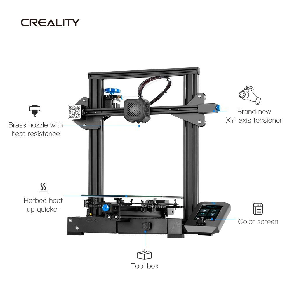 Creality Ender-3 v2 to nowa, usprawniona wersja, łącząca zalety poprzednich modeli ze sporą ilością nowych rozwiązań. Drukarka pozwala na wydruk elementów o wymiarach 220 x 220 x 250 mm, a wymiary całej konstrukcji wynoszą 475 x 470 x 620 mm. Ender-3 v2 posiada całkowicie odświeżony interfejs, nową wersję płyty głównej wyposażoną w cichsze sterowniki oraz szklany stół, dzięki któremu skończą się problemy z wydrukami. Drukarka 3D jest częściowo złożona, dlatego jej montaż jest łatwy i szybki.