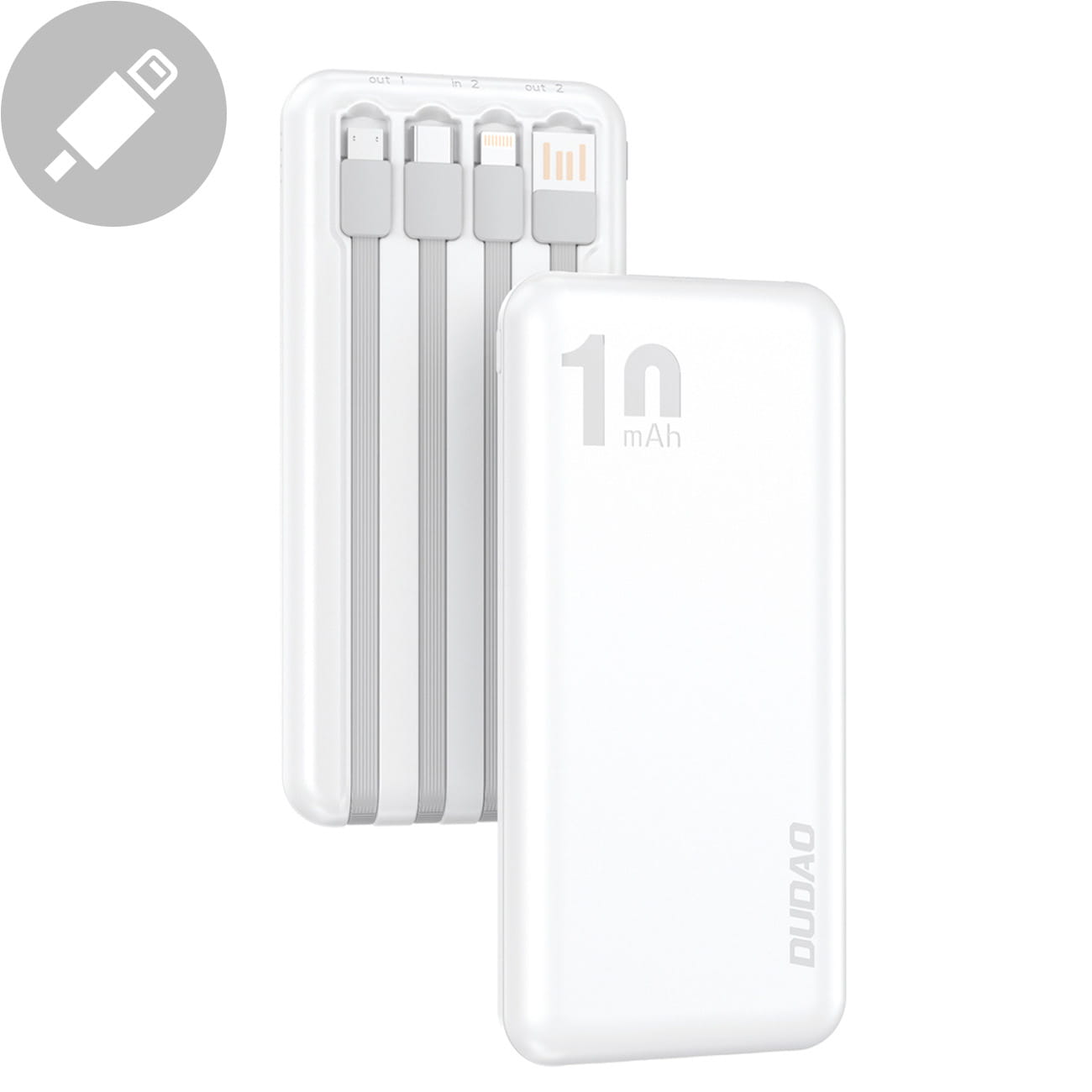 Dudao K6Pro powerbank 10000mAh z kablem USB, USB Typ C, Lightning biały