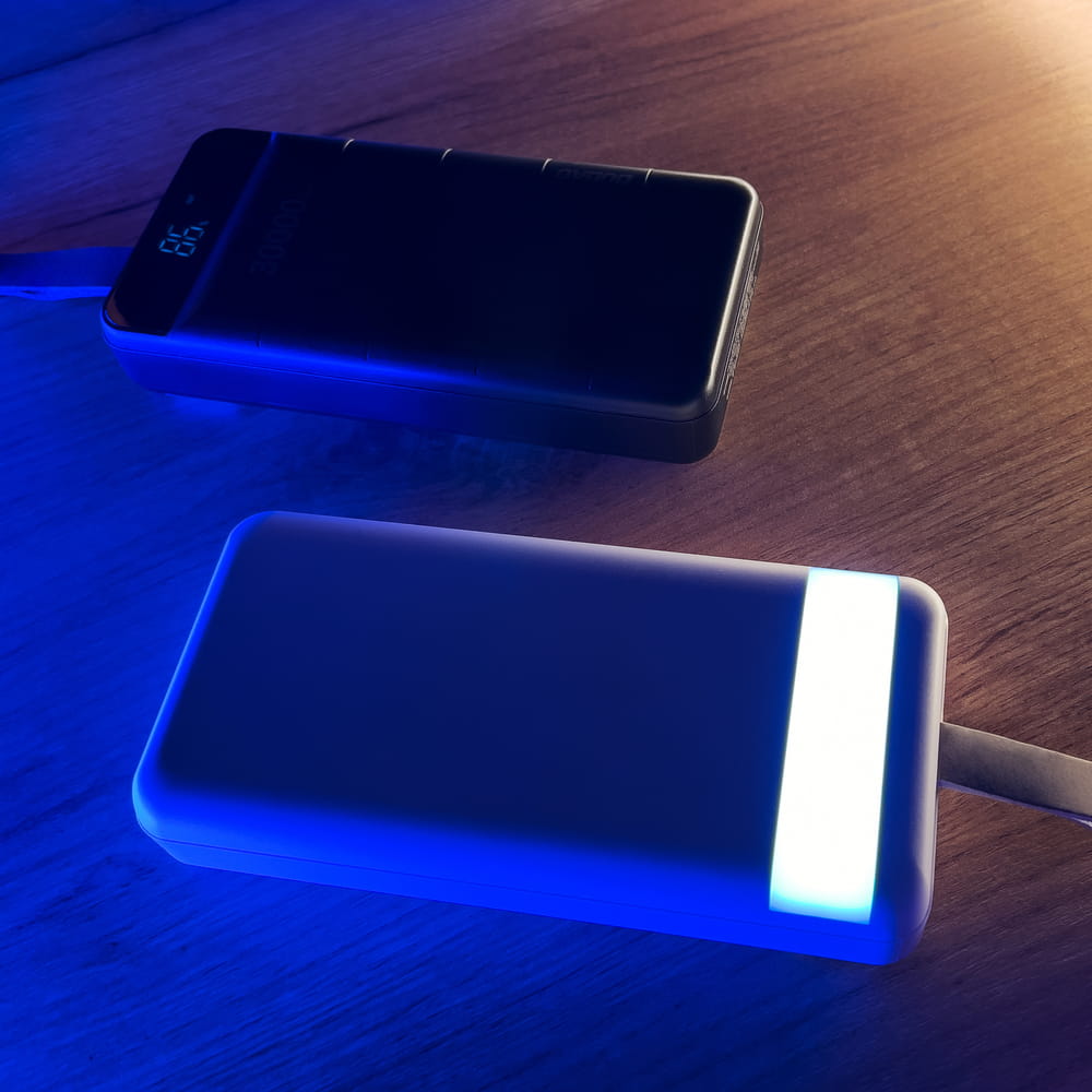 Na obudowie znajduje się pasek, na którym prezentowane są dane dotyczące postępu procesu ładowania urządzeń. Z tyłu z kolei znajduje się lampka LED, która ułatwia lokalizowanie ładowarki w ciemności, a także dodaje jej nowoczesnego charakteru.