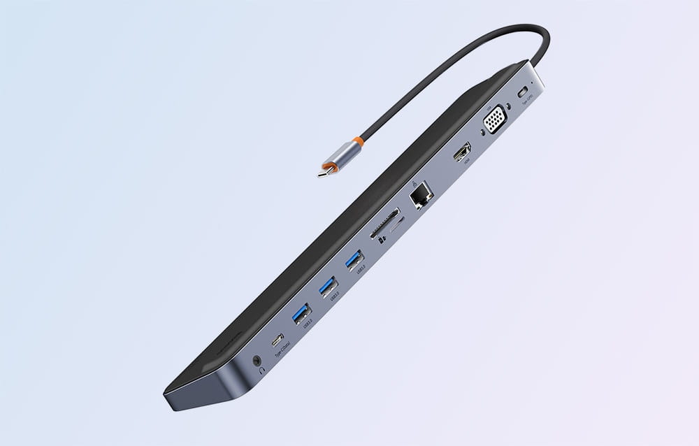Ułatw sobie pracę z komputerem i zwiększ jego możliwości. Hub 11w1 Baseus EliteJoy Gen2 został wyposażony w aż 11 portów – 3x USB 3.0, 3,5 mm audio, USB-C do transferu danych, USB-C do ładowania, slot na kartę SD, slot na kartę TF, RJ45, HDMI i VGA. Może też pełnić rolę praktycznej podstawki pod laptop. Umożliwia przesyłanie plików z prędkością do 500 MB/s i oferuje wysoką jakość obrazu w rozdzielczości 4K. Obsługuje również szybkie ładowanie PD 100 W i wyróżnia się szeroką kompatybilnością.