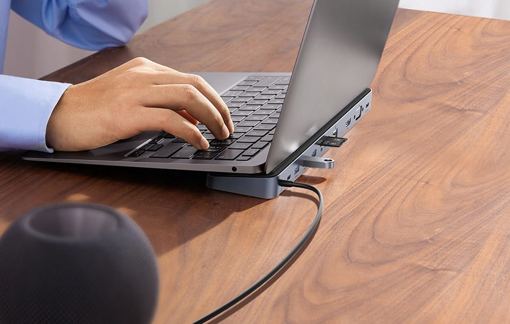 Ciesz się większym komfortem podczas pracy przy komputerze. Hub jest nachylony pod kątem 8° i został zaprojektowany w taki sposób, aby mógł pełnić funkcję podstawki pod laptop. Co więcej, produkt jest pokryty wysokiej jakości silikonem, dzięki czemu zapewni Twojemu urządzeniu niezbędną stabilność i ochroni je przed zarysowaniem. Z Baseus korzystanie z komputera staje się przyjemniejsze!