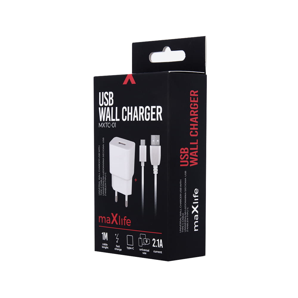 Ładowarka Maxlife MXTC-01 USB 2.1A + kabel USB-C WH