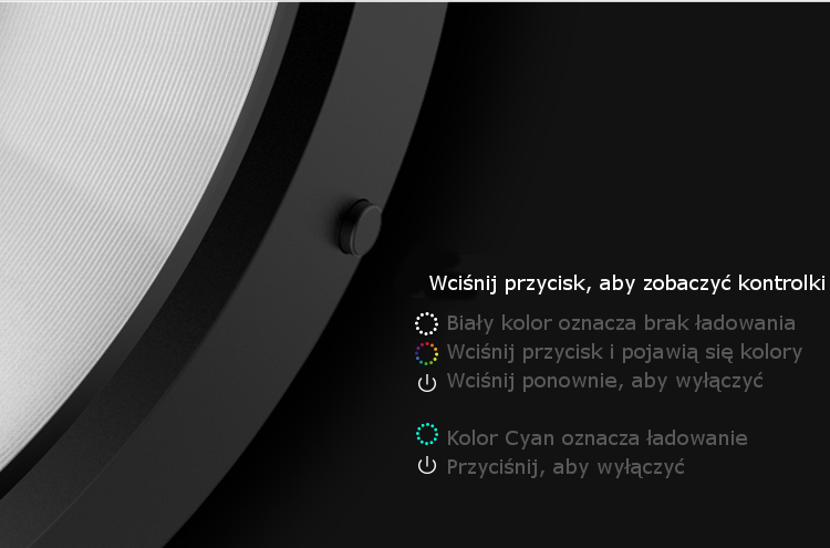 Po przyciśnięciu przycisku, kiedy ładowarka nie ładuje, pokażą nam się różne, świecące na zmianę kolory. Ładowarka może wtedy służyć jako mała lampka nocna.