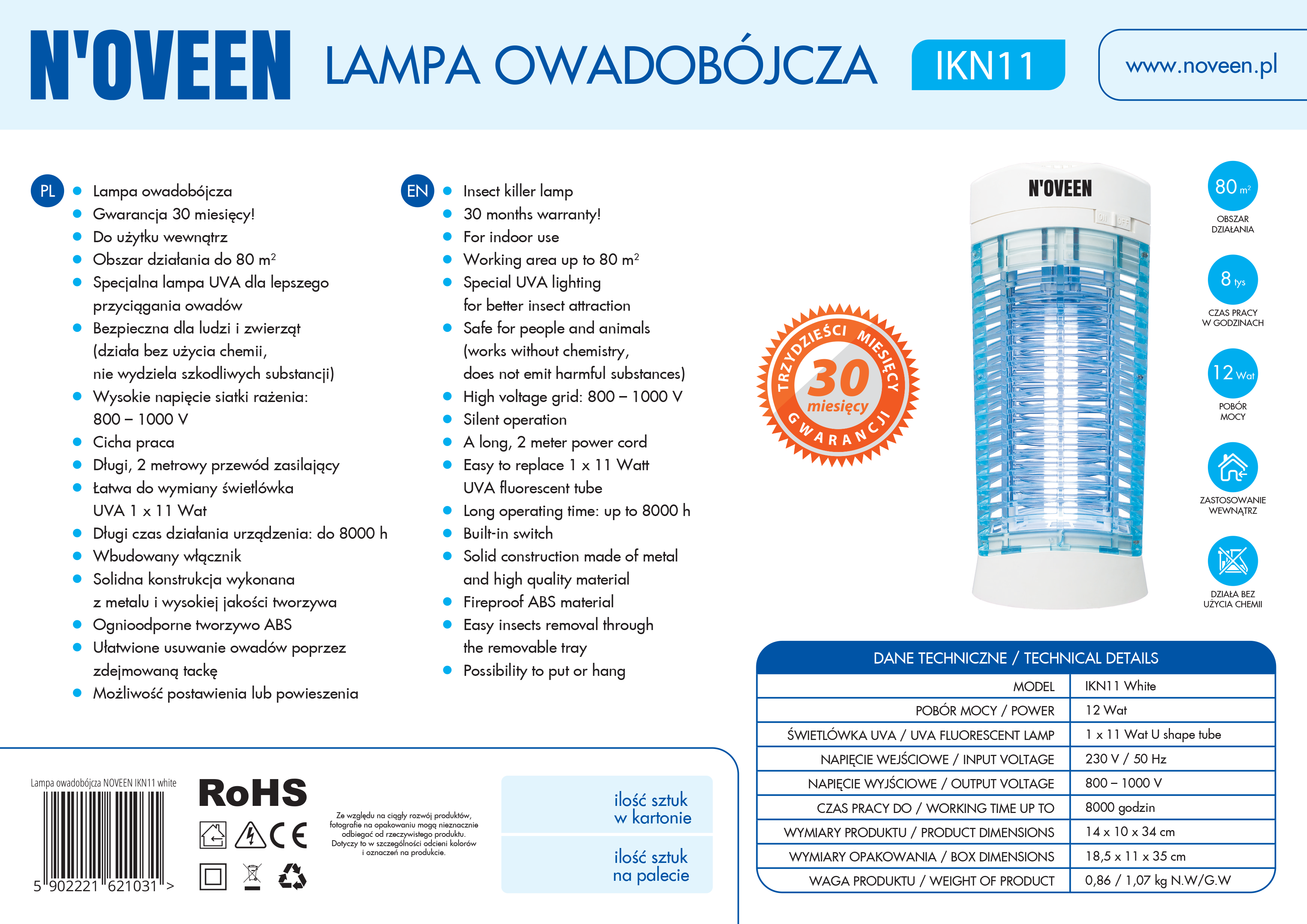 Lampa owadobójcza IKN11 Lampion White o mocy 11Wat, wykonana z metalu oraz wysokiej jakości ognioodpornego tworzywa ABS. Skutecznie zwalcza wszystkie owady latające : komary, muchy i octówki. Urządzenie wytwarza światło wabiące owady, które po dotknięciu siatki zostają rażone prądem pod wysokim napięciem.