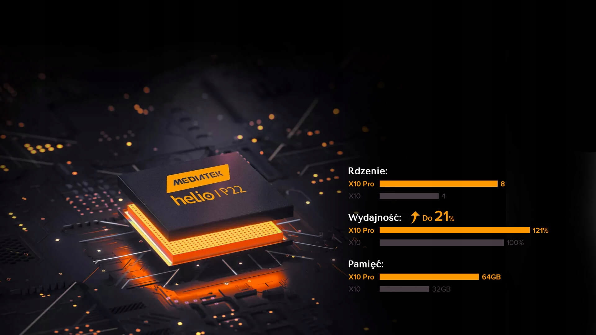 Procesor MediaTek Helio P22 jest mózgiem i sercem Armora X10 Pro. Osiem rdzeni i częstotliwość 2.0 GHz sprawiają, że wydajność telefonu zwiększyła się o 21% w porównaniu do Armora X10. Niezależnie od tego ile aplikacji otworzysz jednocześnie i ile procesorów działać będzie w tle, nie zauważysz żadnych opóźnień. Pamięć wewnętrzna zwiększona do 64GB zapewni wystarczająco miejsca dla wszystkich filmów, zdjęć i utworów.