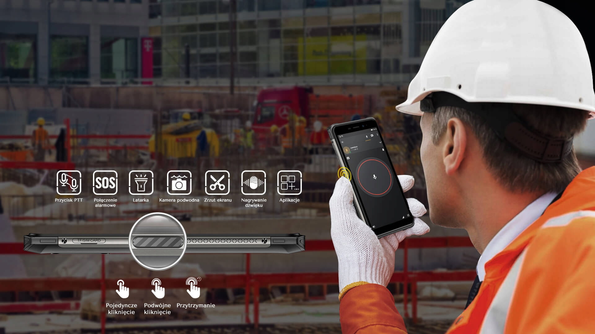 Urządzenie zostało wyposażone w wielofunkcyjny przycisk, który może być zaprogramowany do 6 różnych skrótów funkcyjnych lub szybkiego uruchamiania każdej aplikacji, którą wcześniej ustawisz. Domyślnie jest on skonfigurowany do aktywacji funkcji Push-to-Talk (Zello) po długim naciśnięciu. Korzystając z tego przycisku, możesz cieszyć się skuteczną i efektywną komunikacją bez żadnych kłopotów.