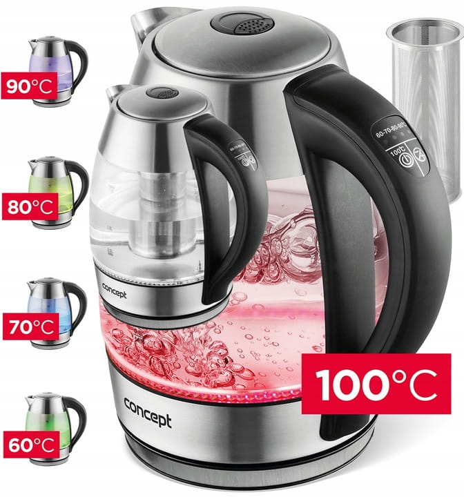 100°C (czerwone podświetlenie) i funkcja KEEP WARM… czarne, owocowe i ziołowe herbaty, kawa po turecku.