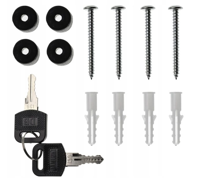 - Kołki rozporowe ze śrubami do montażu (4 szt.) oraz dwa klucze w zestawie.