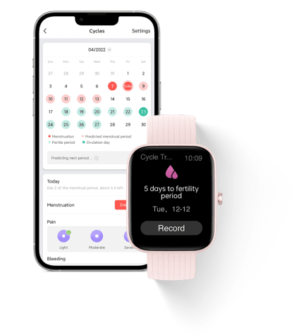 Zegarek rejestruje aktualną menstruację, a także przewiduje i przypomina o nadchodzących miesiączkach i okresach płodnych, aby pomóc Ci planować długoterminowo.