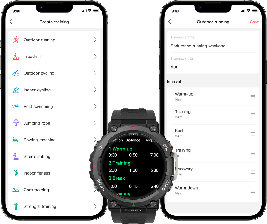 Konsekwencja to klucz do sukcesu. Utwórz własne szablony treningowe dla 11 różnych dyscyplin sportowych w aplikacji Zepp App, które możesz śledzić na swoim urządzeniu Amazfit T-Rex 2.