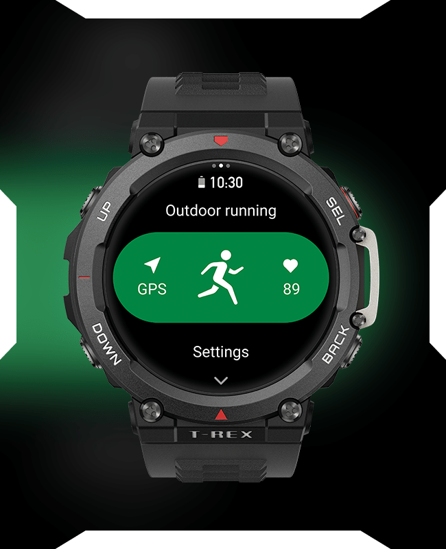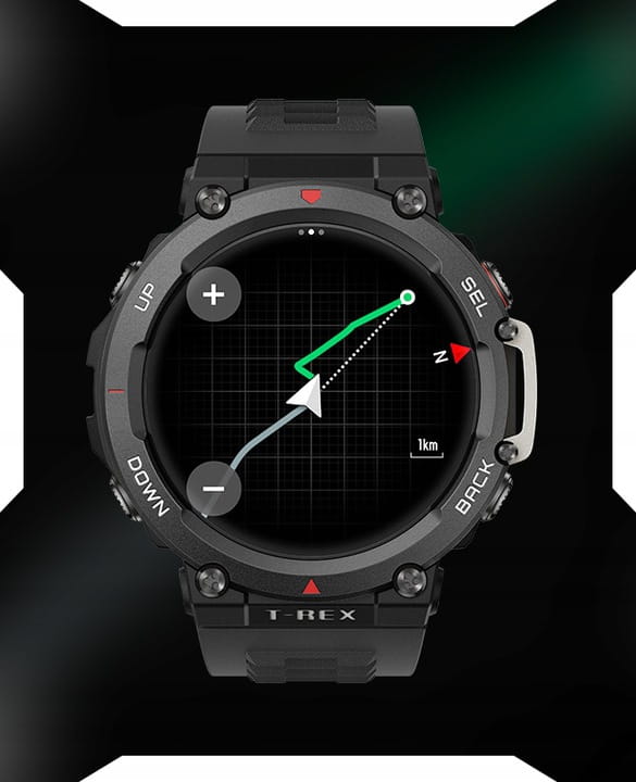 Zegarek Amazfit T-Rex 2 został wyposażony w duży ekran, który ułatwia przeglądanie danych najbardziej przydatnych podczas Twoich wędrówek - niezależnie od tego, czy świeci na Ciebie słońce pustyni, światło miejskich latarni, czy księżyc w pełni. Matowe wykończenie zegarka i zewnętrzna ramka pokryta metalicznym lakierem zostały uzupełnione o silikonowy pasek odprowadzający pot, dzięki któremu zegarek pozostaje suchy i jest wygodny w noszeniu – nawet, gdy stawiasz czoła żywiołom natury.