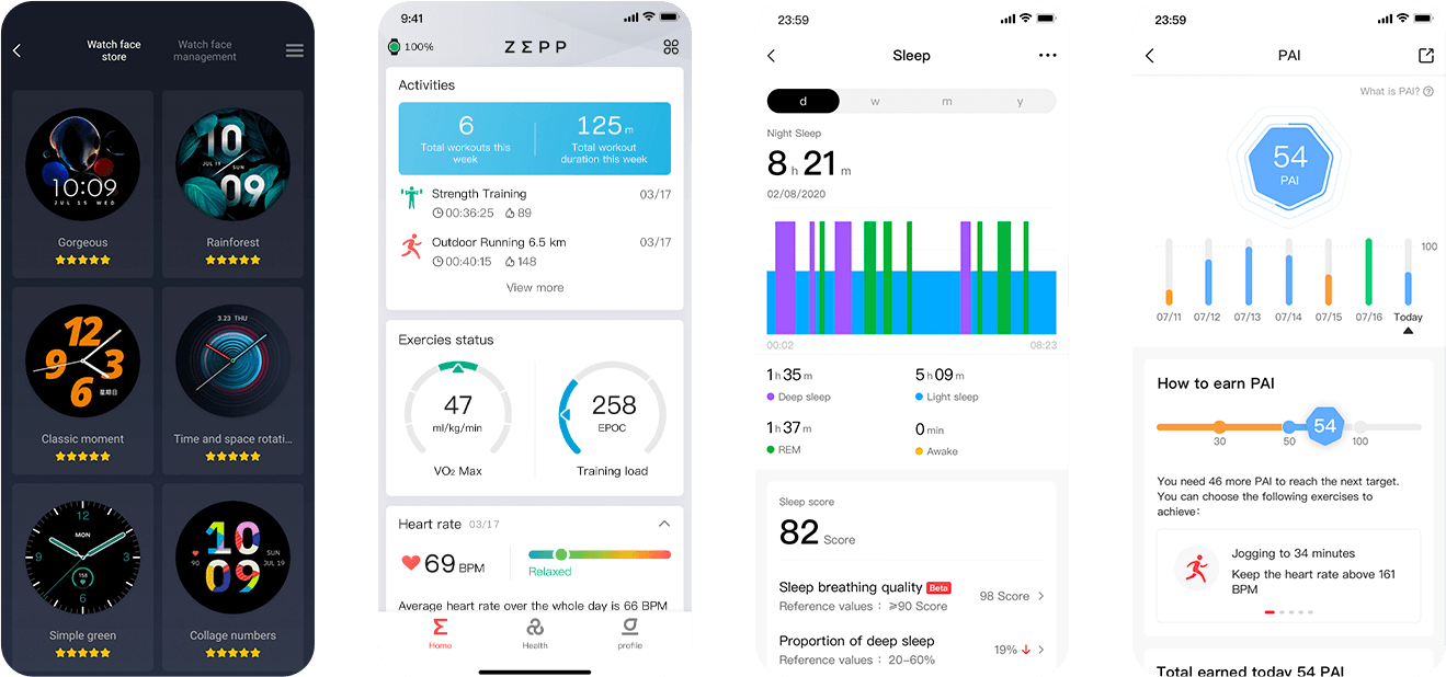 Wbudowana aplikacja Zepp App umożliwia wyświetlanie i analizę danych dotyczących zdrowia i treningów, zawiera e-sklep z tarczami zegarków, zapewnia aktualizacje systemu zegarka oraz ułatwia zarządzanie tym inteligentnym urządzeniem.