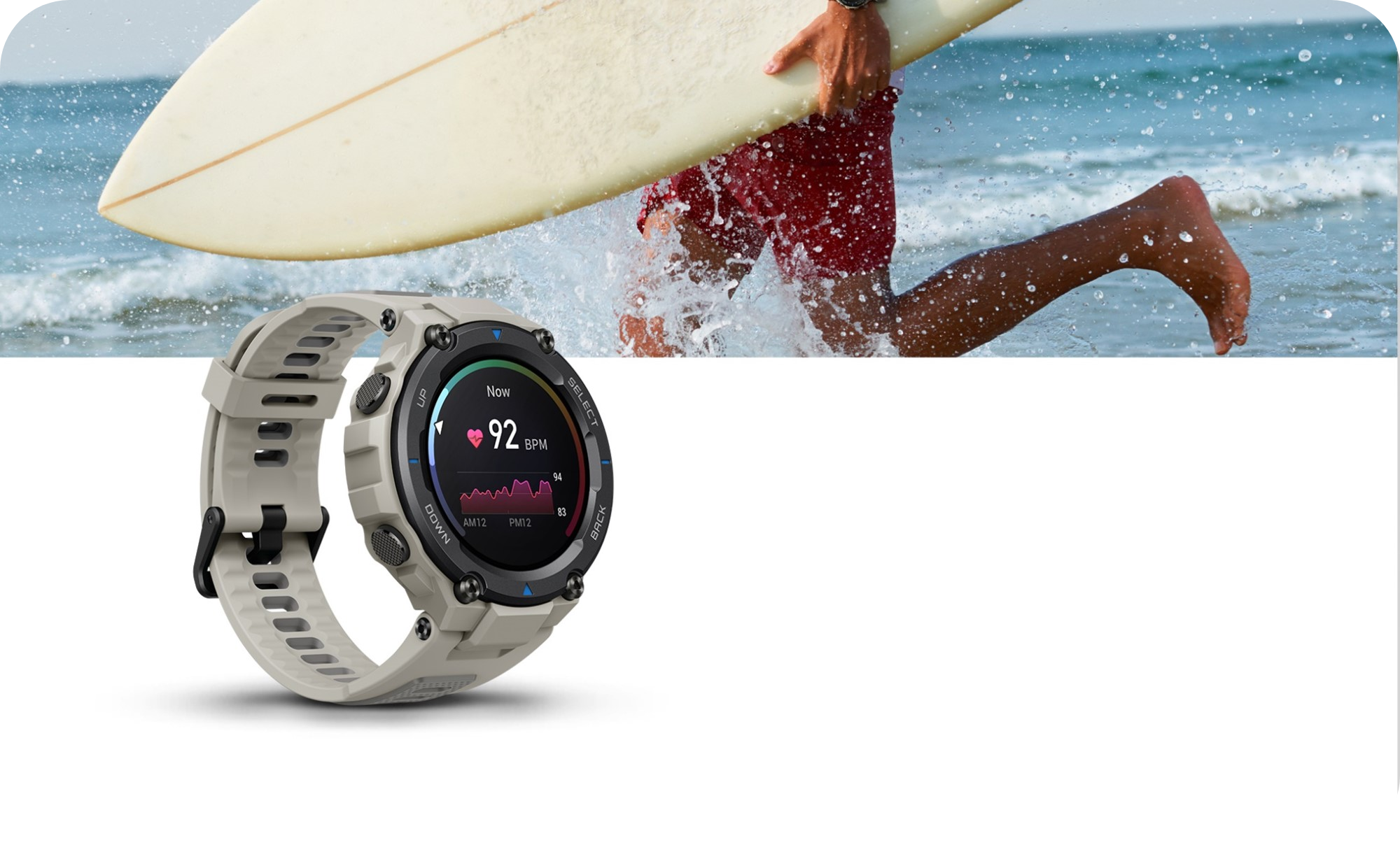 Dzięki klasie 10 ATM Amazfit T-Rex Pro jest wodoodporny do głębokości 100 metrów lub może towarzyszyć Ci podczas surfowania, pływania czy wspólnego odkrywania tajemniczego podwodnego świata.