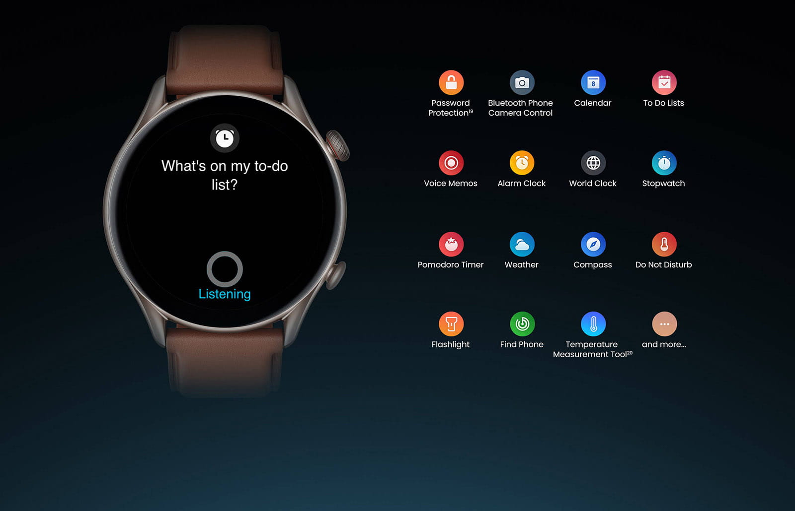 Zepp OS pozwala szybko znaleźć potrzebne informacje w aplikacjach na GTR 3 Pro. Aby ułatwić nawigację, zegarek ma fizyczne kółko przewijania z liniowym silnikiem wibracyjnym, co zapewnia lepszą reakcję na dotyk. Wbudowany samodzielny asystent głosowy Alexa pomoże Ci ustawić alarm, znaleźć odpowiedni kontakt lub sterować inteligentnymi urządzeniami domowymi. Alexa działa w trybie offline z ograniczoną obsługą poleceń głosowych.