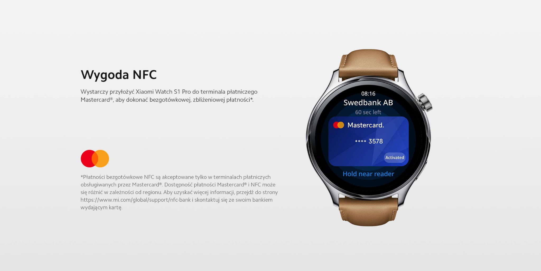 *Płatności bezgotówkowe NFC akceptowane tylko w terminalach płatniczych obsługiwanych przez Mastercard®. Dostępność płatności Mastercard® i dostępność NFC może się różnić w zależności od regionu. Aby uzyskać więcej szczegółów, wejdź na stronę https://www.mi.com/global/support/nfc i skontaktuj się ze swoim bankiem wydającym kartę, aby uzyskać więcej informacji.