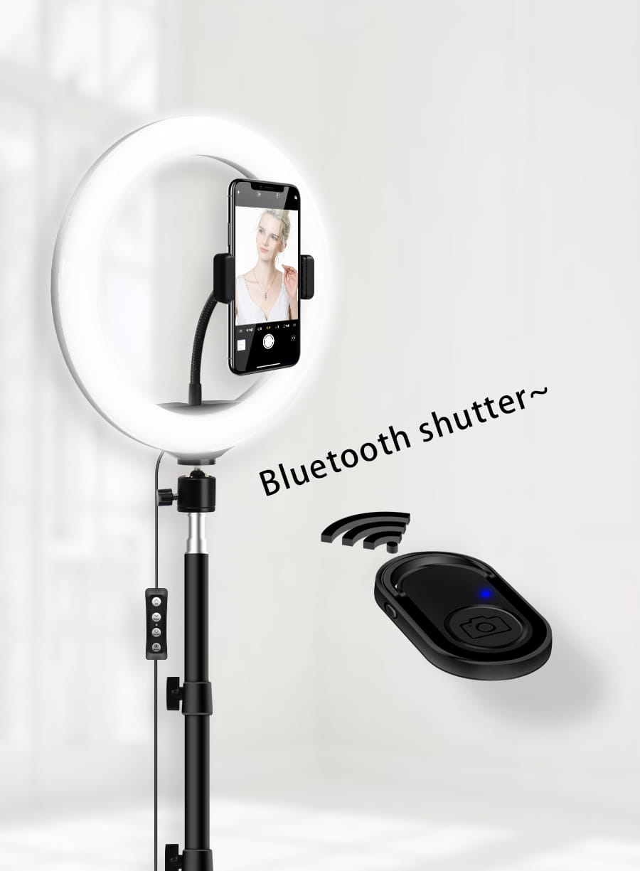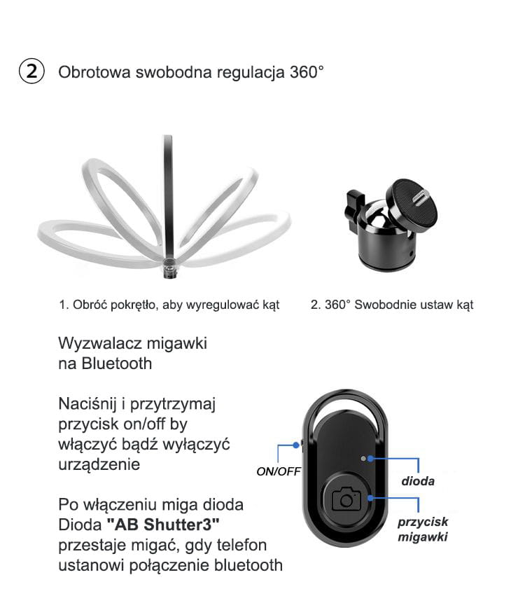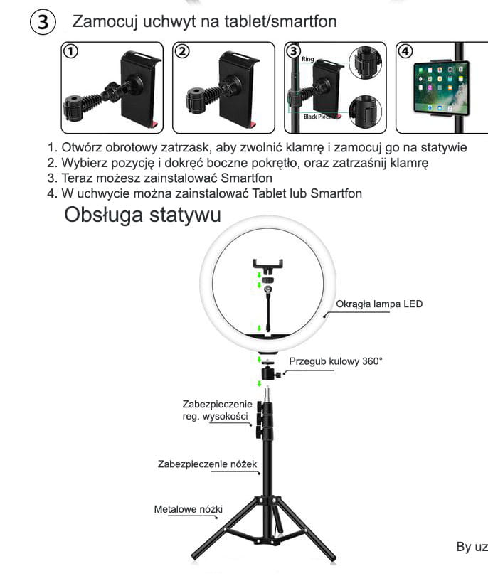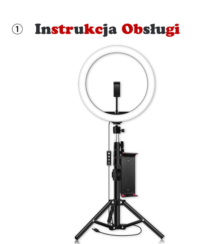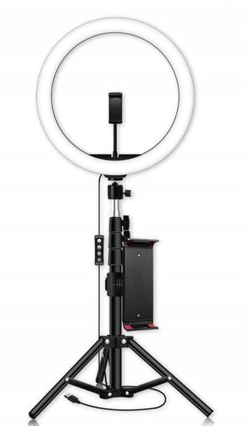 ✅ Lampa posiada mocowanie uchwytu telefonicznego znajdującego się w zestawie, pozwalającego na umieszczenie smartfona lub tableta w środku kręgu oświetlającego.