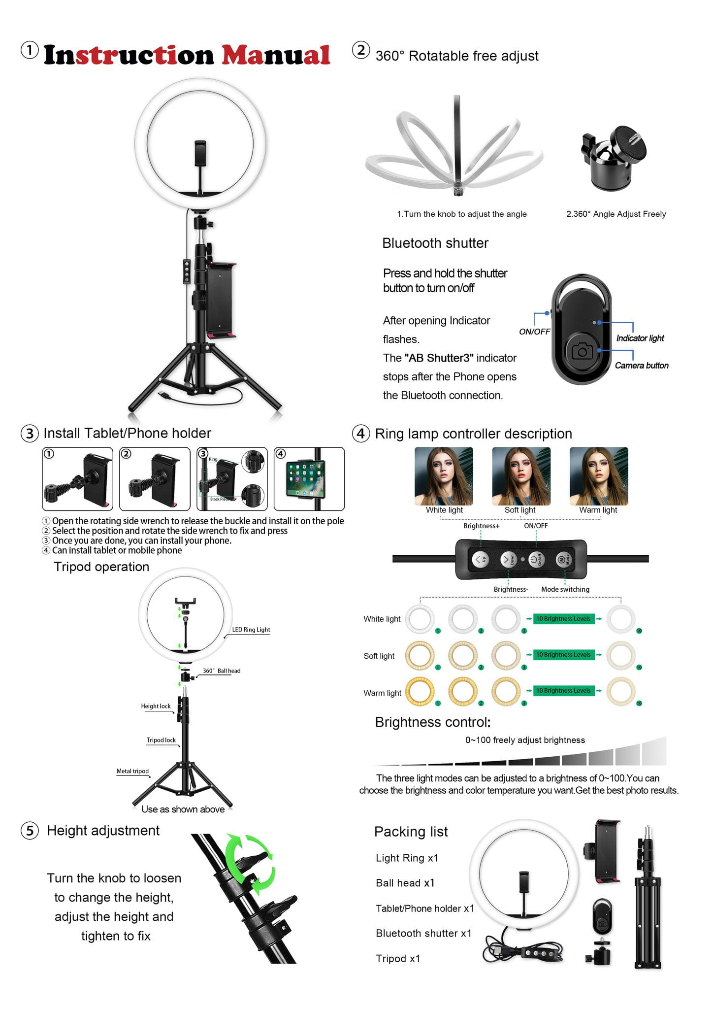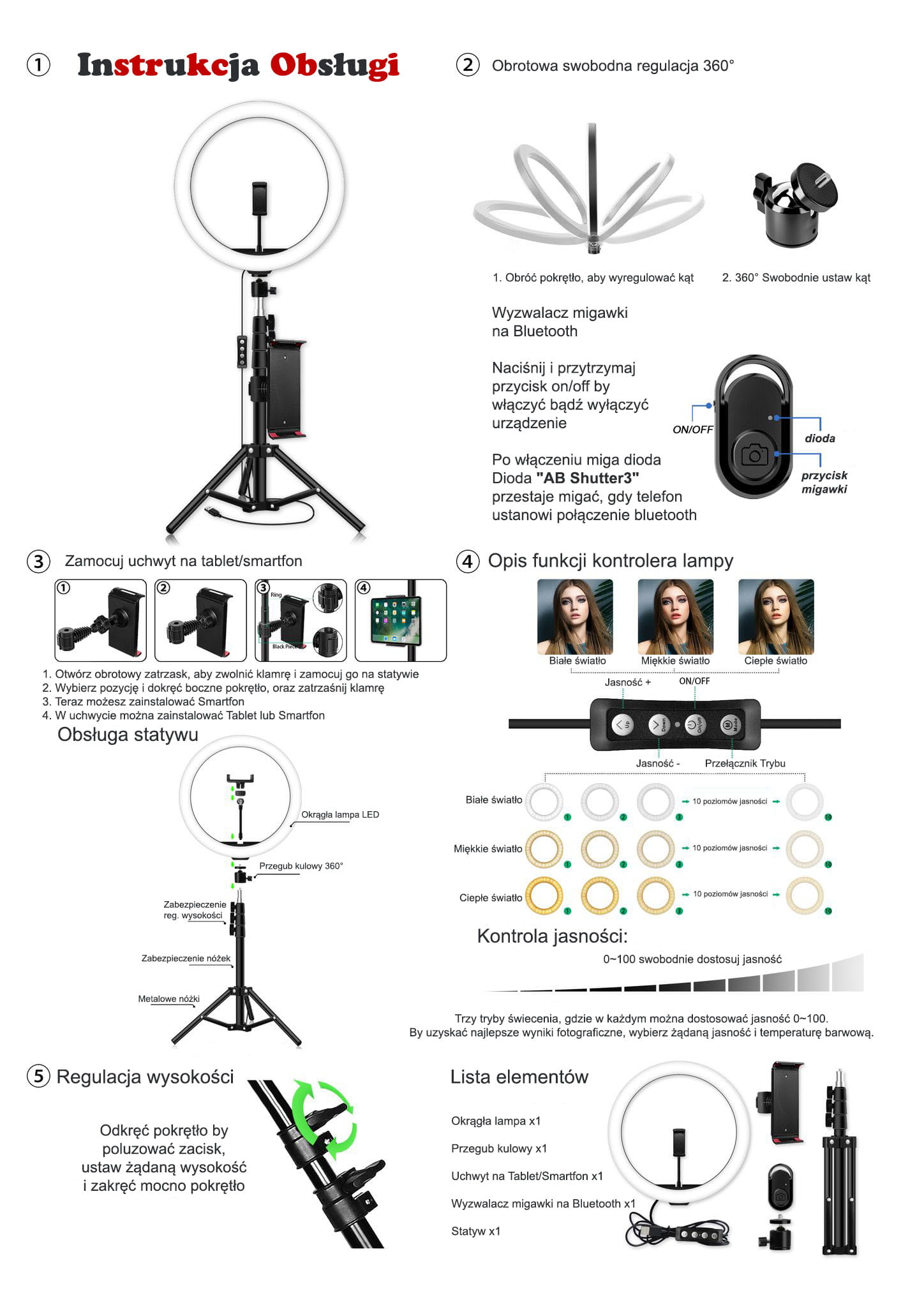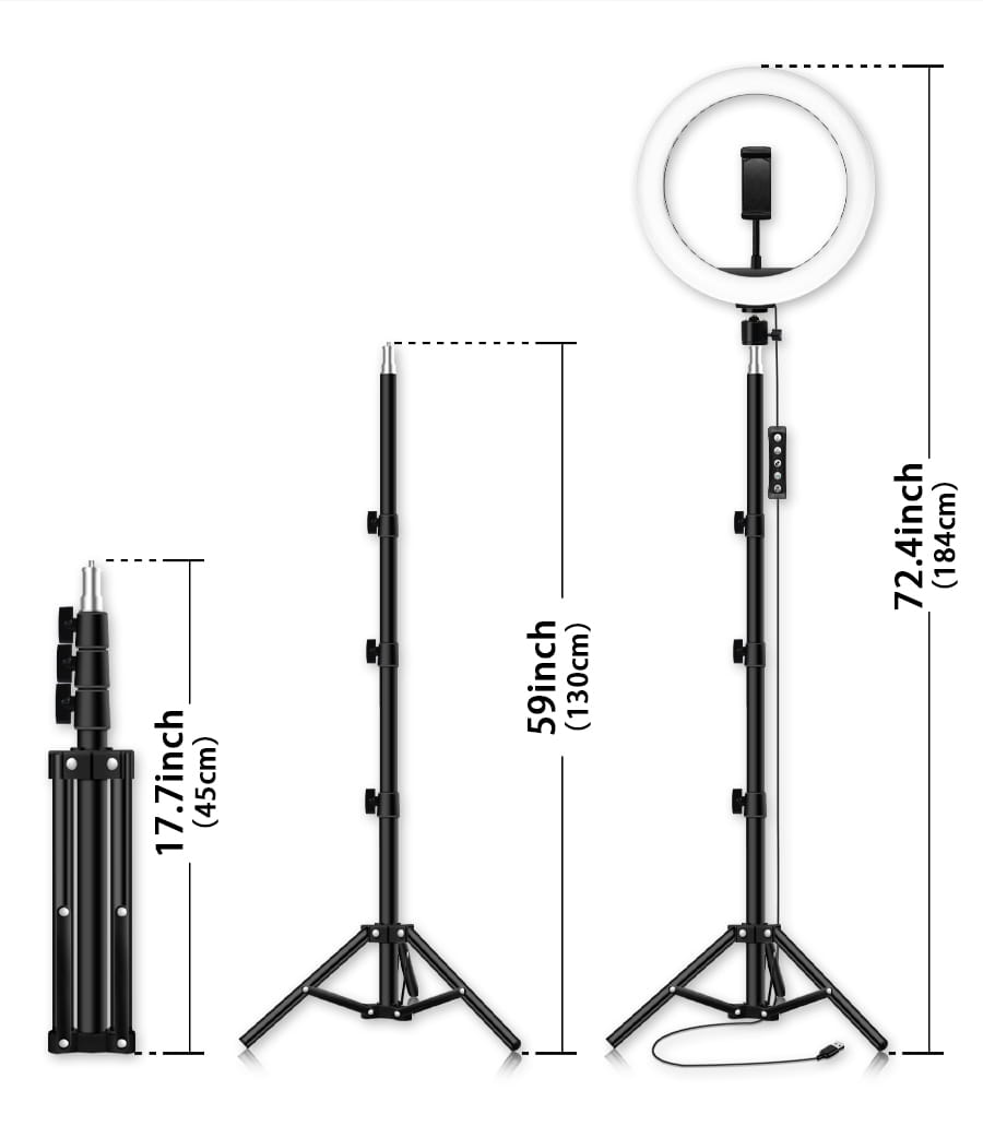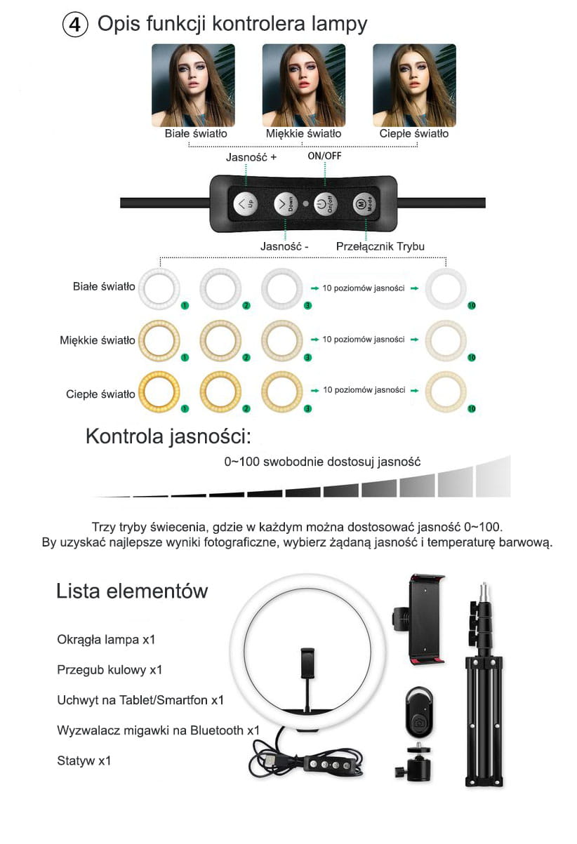 ✅ Lampa pierścieniowa charakteryzuje się średnicą 24 cm (30 cm zewnętrzna) oraz 160 diodami LED, równomiernie rozmieszczonymi w obudowie pierścienia oświetlającego. Posiada regulację natężenia oświetlenia w zakresie 600-1300 lm oraz regulację temperatury barwowej (3 tryby) w zakresie od 2700 do 7000 K.