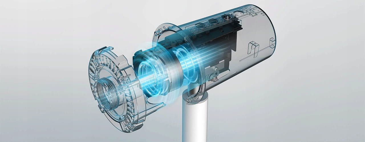 Wentylator jest wyposażony w silnik z miedzianym drutem DC, który charakteryzuje się wyższą wydajnością pracy i większą trwałością niż silnik z aluminiowym drutem. Zapewnia stałą prędkość, bardziej stabilną wentylację i mniejsze zużycie energii. Łopatki w kształcie skrzydła zapewniają maksymalny przepływ powietrza na poziomie 20 m³/min*.