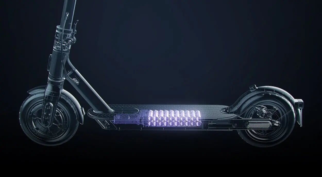 Akumulator jest wbudowany w podstawę hulajnogi, co zmniejsza środek ciężkości i zwiększa stabilność jazdy