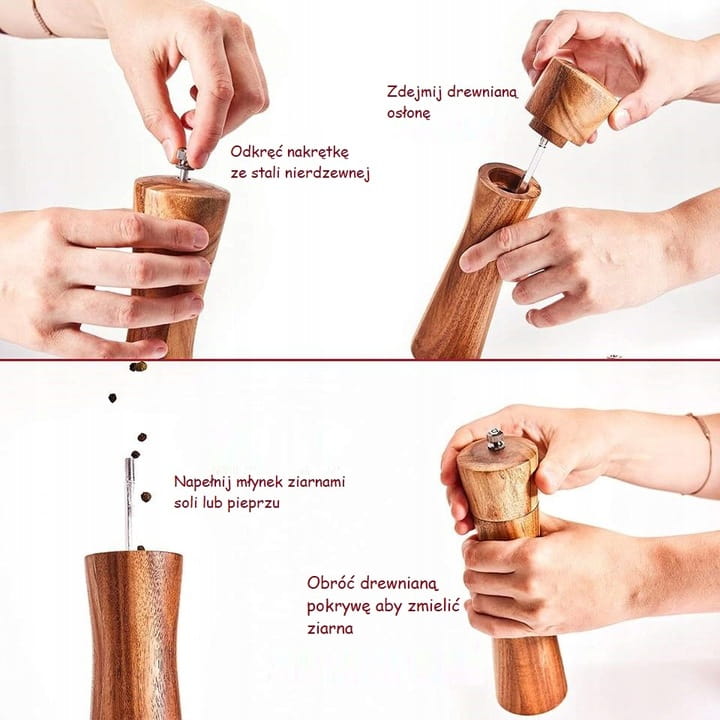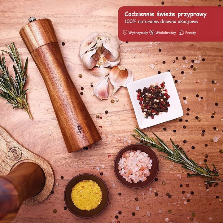 Zestaw młynków ręcznych do soli i pieprzu posiada skuteczny i efektywny ręczny mechanizm rozdrabniający.